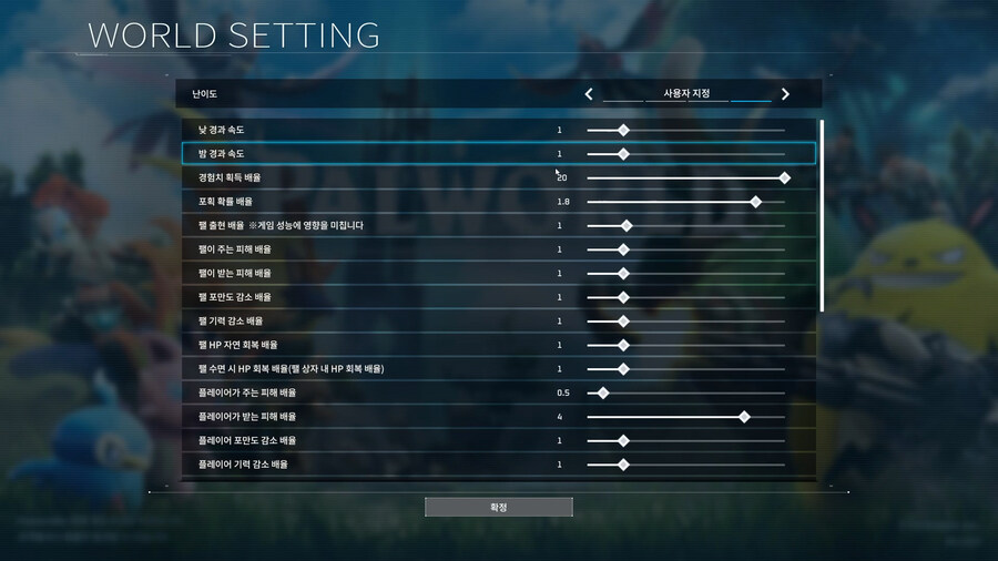 경험치획득배율, 포획확률 등의 다양한 세팅이 가능하며 나중에 세팅은 다른값으로 변경가능합니다.